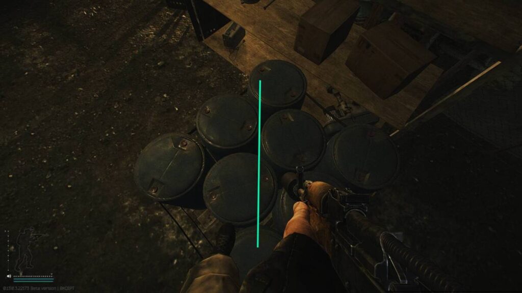 모두가 지구력 레벨이 높은 편에 속하는 것은 아니죠. 일반적으로 사용할 수 있는 방법을 알려드리도록 하겠습니다. 첫 번째 하이딩 스팟에 비하여 까다롭기 때문에 몇 번 정도 연습이 필요할 것입니다. 일종의 트릭이기 때문에 그렇습니다. 먼저, 드럼통 위로 올라가 표시된 선상을 바라보고 대각선 끝에서 준비를 하도록 합니다.