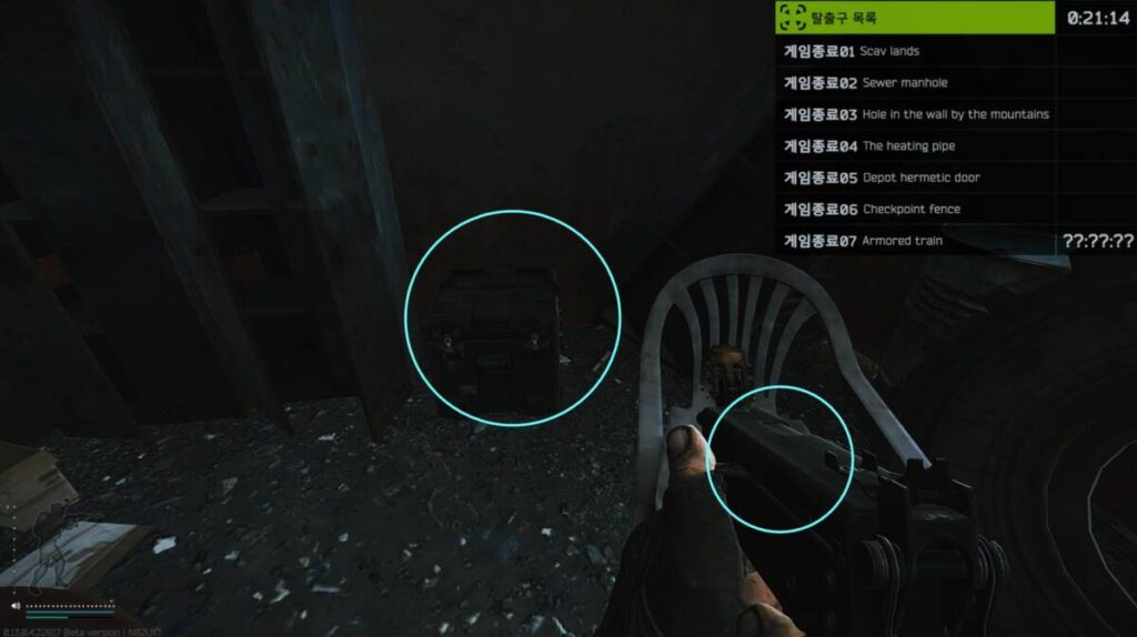 아무래도 PMC가 자주 다니는 지역에서 스캐브를 직접적으로 스폰시켜주는 방식으로 운영되고 있지 않기 때문인데요. 역사 주변에서 스폰되는 것이 오늘 공략을 위한 1티어 스폰이라고 생각하시면 됩니다. 더불어 오른쪽 위 탈출 시간을 한 번 체크해주시기 바랍니다. 본 공략은 실시간으로 이루어져 있기 때문에 정말로 5분이 채 걸리지 않는다는 것을 아실 수 있습니다.