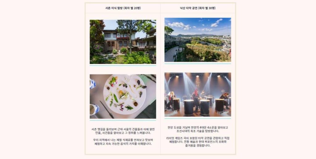 앞서 언급하였듯, 티모 문화 유산 원정대는 역사 교육 프로그램입니다. 때문에 우리나라의 역사와 관련된 장소는 물론, 문화를 향유할 수 있는 기회가 주어집니다. 그렇기에 위 사진처럼 서촌에 있는 장소를 거닐기도 하고, 그곳에서 우리나라 고유 식재료의 맛을 향유할 수 있는 시간을 가질 수 있습니다. 또한 월 2회로 운영되는 것이기에, 낙산 타악 공연에 가볼 기회도 있는데요. 한양의 4대문 4소문이 메인이 되는 것으로, 조선시대 축조 기술을 엿볼 수 있는 기회를 제공하고 있습니다.