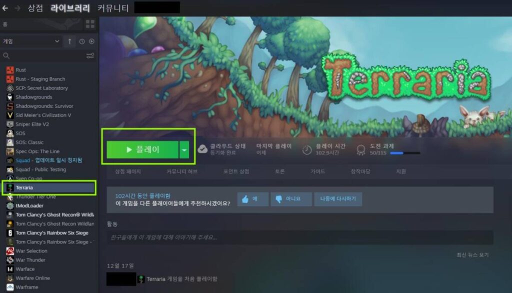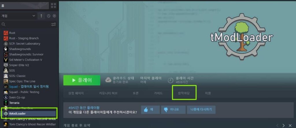 설치가 완료되었다면 스팀에서 라이브러리를 클릭하여 자신의 게임들이 있는 곳으로 돌아와주세요. 여기서 tModLoader를 클릭해보면 가운데에 창작마당이라는 글씨를 찾으실 수 있으실 겁니다. 이 글씨를 클릭하면 모드들이 나열되어 있는 페이지로 넘어가게 됩니다. 프로젝트 좀보이드나 다른, 모드가 적용되는 게임들을 해보신 분들이라면 굉장히 익숙한 장면일 거라는 생각이 드네요.