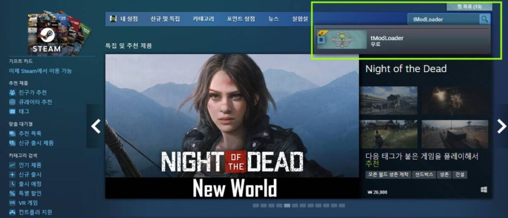 테라리아가 설치가 되어 있다면 스팀에서 상점으로 향하고, 검색란에 다음과 같이 검색해줍니다. “tModLoader” 이건 테라리아 런쳐 같은 것인데, 바닐라 버전에서 모드가 적용될 수 있도록 도와주는 역할을 합니다. 이 부분에서 조금 헤매시는 분들이 다소 계시는 것 같은데, 테라리아만 가지고서 모드 설치는 불가능합니다. 반드시 이 tModLoader 를 설치하셔야 모드 설치 및 적용이 가능합니다.