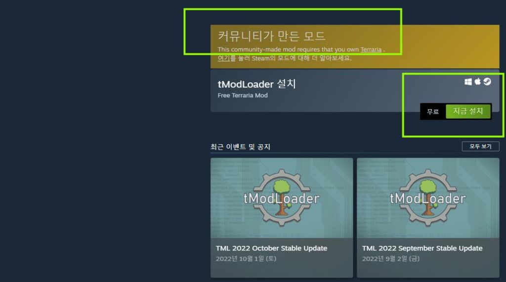 상점 페이지에서 tModLoader를 찾아서 클릭하셨다면 위 이미지처럼 설치할 수 있는 화면이 나타날 것입니다. 여기서 지금 설치를 클릭하시면 됩니다.