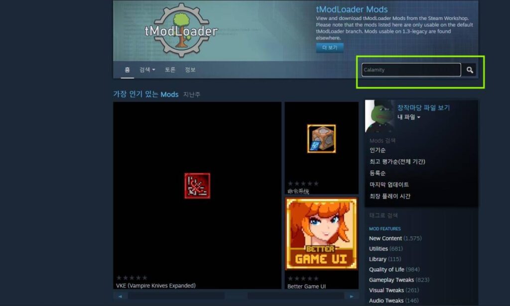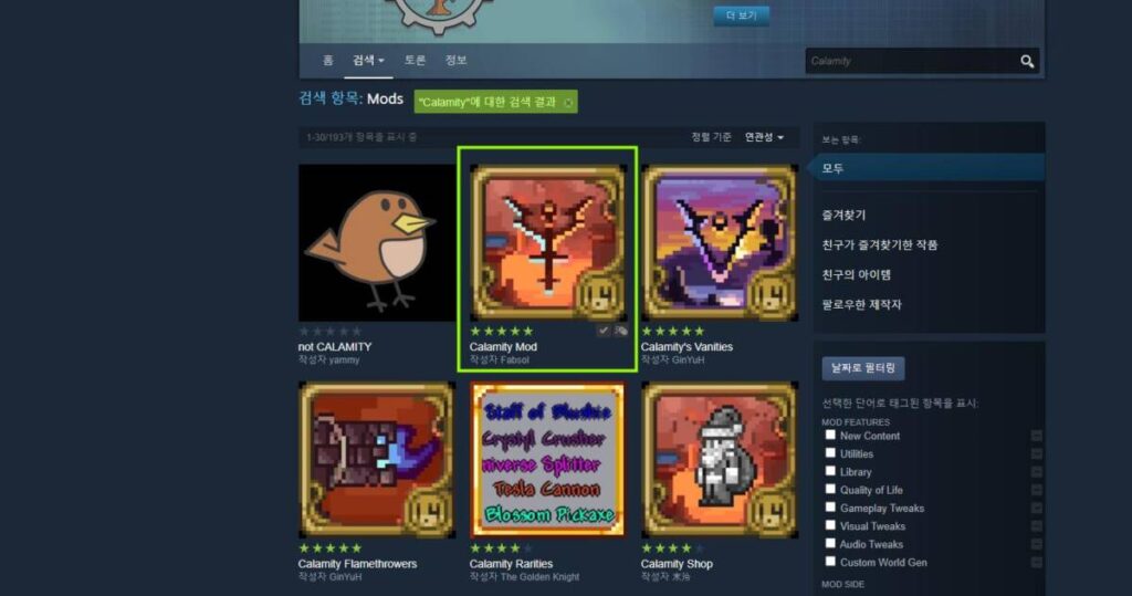 창작마당을 눌렀다면 위 사진처럼 모드들이 여러 개가 보이실 겁니다. 상점에서 tModLoader를 검색했던 것처럼 여기서는 모드의 이름을 검색해주면 됩니다. 모드 이름은 Calamity 입니다. 한글로 칠 경우에는 검색이 원활하게 되지 않기 때문에 반드시 영문으로 진행해주시길 권장합니다.