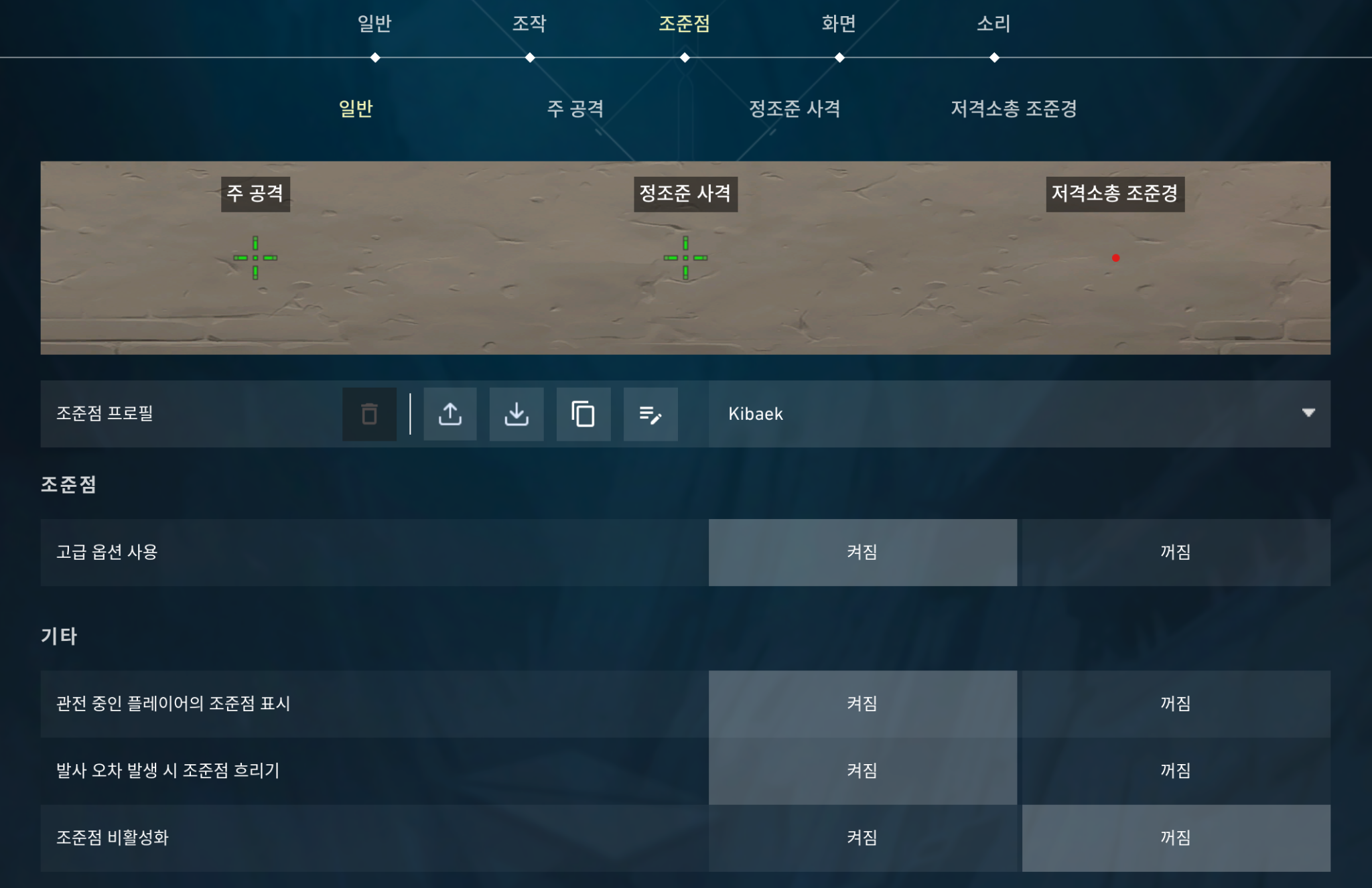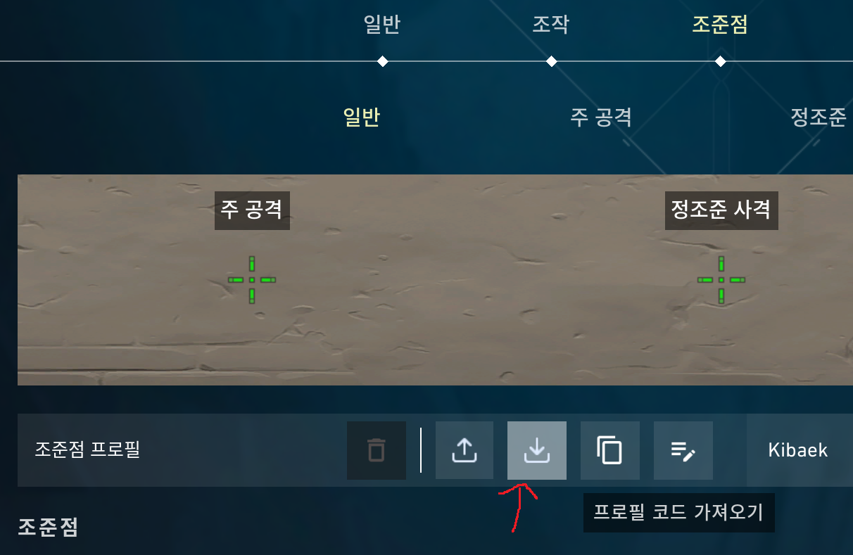- 발로란트 실행 → 설정 → 조준점 탭 → “프로필” 옆에 화살표 버튼 클릭