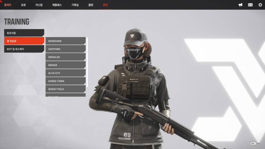 먼저, 베일드 엑스퍼트에서 훈련모드를 하려면 로비에서 상단에 ‘훈련’ 버튼을 누른 뒤에 맵 연습장 탭을 클릭하면 됩니다. 이 때 본인이 원하는 맵을 클릭하면 곧바로 로딩이 이어지는데요. 자신이 생각했을 때 약하다고 생각하는 맵이나, 승률이 저조한 맵 등 분석할 이유로 맵을 선택해도 되고 장비 연구를 위해서 아무 곳이나 선택해도 됩니다.