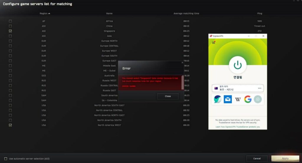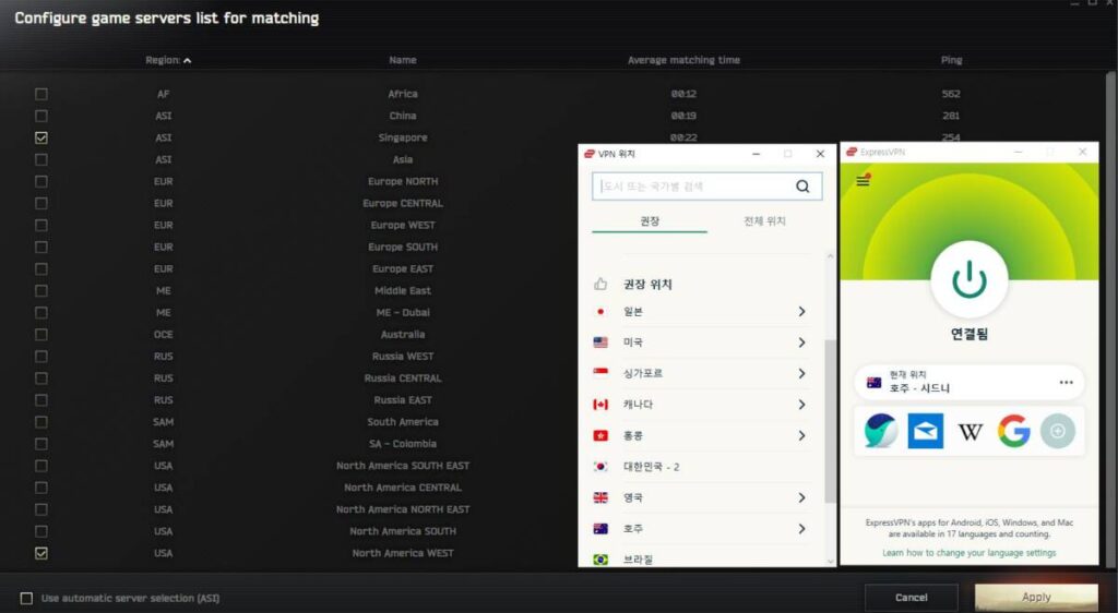 어떤 분들은 런처를 통해서 서버를 선택해서 바꾸기만 하면 되는 것인 줄 아는 경우도 있는데요. 아마 위처럼 “핑이 높아서 선택이 불가합니다” 라는 경고문이 나타날 것입니다. 혹은 선택 가능하더라도 인게임에서 디싱크나 핑킥과 같은 현상이 계속해서 이어질 것이 확실합니다. 때문에 문제점들을 해결하기 위해서 익스프레스VPN 을 이용하는데요. 현재 호주 서버로 위치를 잡아두었기 때문에 싱가폴 서버는 선택이 불가능한 모습입니다.